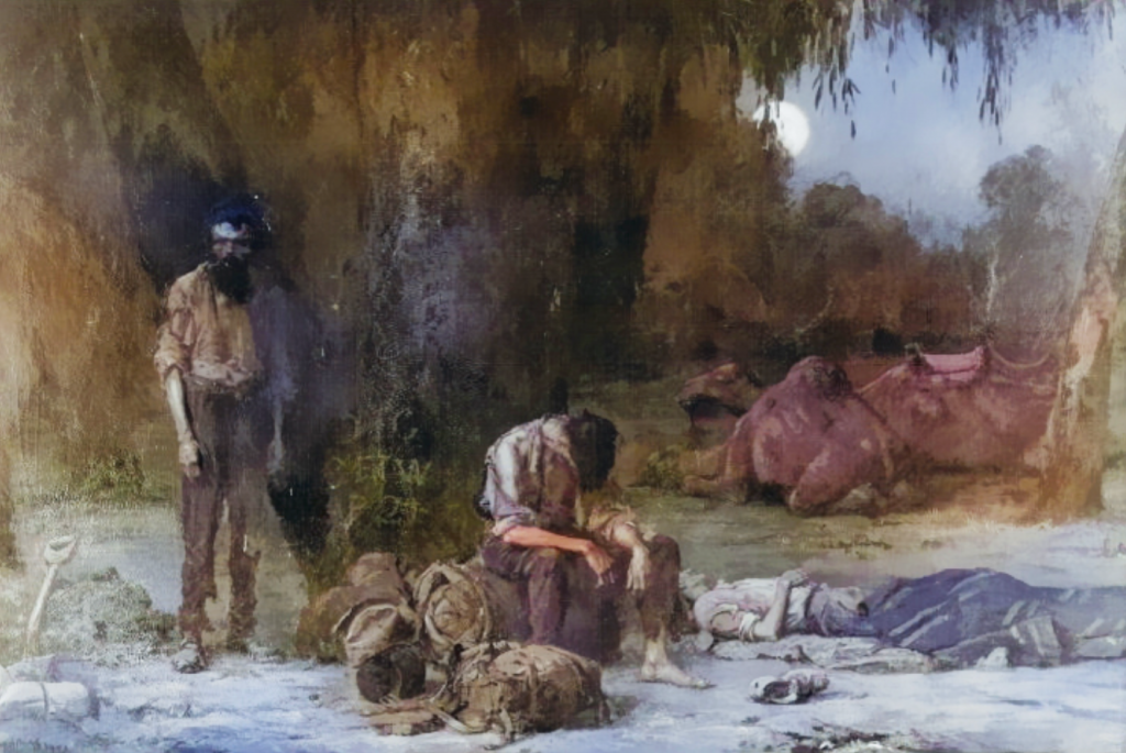 Just over nine hours later, at about 7.30 in the evening, Burke, Wills and King staggered into the camp after force marching the last 30 miles that day. It was a staggering achievement for men in such weakened condition. Their supreme effort was in vain, they were greeted only by the silence of the camp; they had missed their salvation. John Longstaff’s painting captured the scene in graphic detail. In this painting, Burke stands close to the dig tree, looking almost like a ghost looking silently out at the world in disbelief. Wills sits slumped on the camel pack and King, overcome with physical exhaustion, lies on the ground.