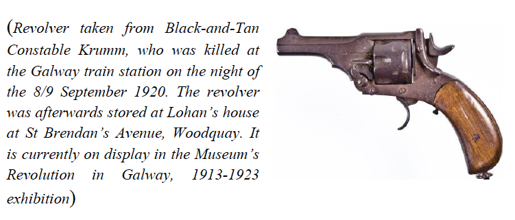 Lohan was attached to the Galway City IRA Company during the war of independence (1919–1921). Following a shootout at Galway train station on 8-9 September 1920, during which Black-and-Tan Constable Edward Krumm and an IRA Volunteer John ‘Seán’ Mulvoy were killed, Krumm’s revolver was captured and stored at Lohan’s house at St Brendan’s Terrace, Woodquay – it is currently on display at Galway City Museum.