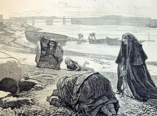 However, various sources suggest that four wells were situated within the original larger Lough Atalia land possessed by the Augustinians. In more recent times, during the laying of a foundation of a railway line extension, a circular stone-walled well was temporarily exposed. Meanwhile, various editions of ordnance survey maps show three other wells along the actual shoreline of Lough Atalia itself. One was depicted opposite the entrance to the Forthill Cemetery of today and the London Illustrated News of 16 September 1871 depicts shawled women praying beside it, with a train crossing the railway bridge in the background. That well is now covered over by a landfill opposite the Galway Bay Seafoods establishment.