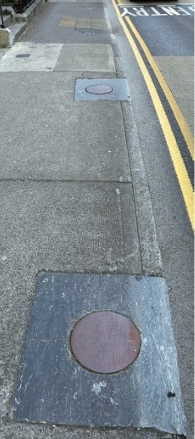 A few footsteps onwards, back here on Prospect Hill, and another pair of iron reminders from the past greets the eye. Surrounded by the concrete paving of today, two circular iron coal cellar lids lie redundant now, their job of allowing access for imported coal now long past. Time, in the form of countless footsteps, have erased writing or embellishments on their surface, but at least they remain, when hundreds of others have been removed with the advent of electricity.