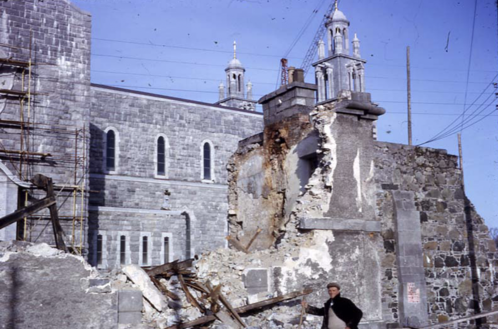 The front wall of the Galway Jail being knocked down, with the new Galway Cathedral emerging in the background