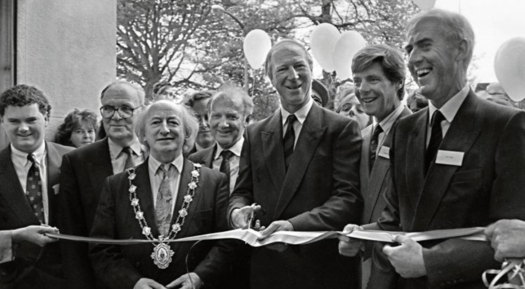 Big Jack Opening the Eyre Square Centre Jack Charlton cutting the tape for the opening of the Eyre Square Shopping Centre on 16 May 1992. Councillor Michael D. Higgins, Mayor of Galway, on the left also took part in the ceremony