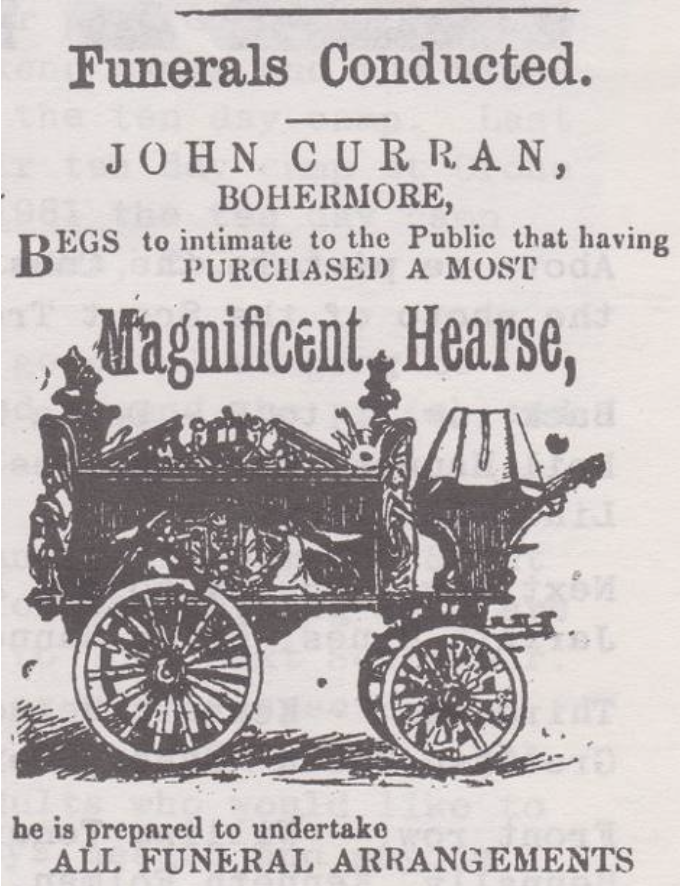 On the right side of the entrance to Water Lane there was another pub called Nelly O’s. I believe her last name was O’Connor, and I don’t recall any activity outside her door on Sunday mornings. Now back on the right side of the road again, almost directly across from Waterlane, was Small’s Shop, which later became Sharkey’s. I vaguely remember a fish and chip shop and even a launderette there somewhere along that row. Mr Cloonan the carpenter had a coffin workshop along there also. I never met a friendlier coffin maker in all my travels. If his door was open when we were passing, being children, we were afraid to look inside in case there might be a fully occupied coffin looking out at us.