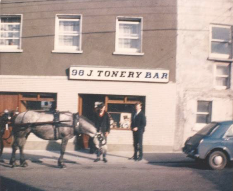 Continuing up along Bohermore, about ten steps from O’Learys, on the same side, was Connelly’s, a tiny neat Little Shop. The old couple had lived in Boston when they were younger, so on my trip’s home from Boston, I enjoyed our little chats when I would pop in. They had three children, a girl and two boys, one of whom served mass with me in Saint Patrick’s years ago. A little further up the road there was a little pub called Martyn’s, where Tonery’s is now. I remember being sent in there one time when I was about 11 years old by an elderly neighbour to buy a small bottle of whiskey, a Baby Powers, for medicinal purposes of course. It was very dark inside and I was scared. There was a paraffin oil lamp burning and the scent filled the dark air. I don’t think there was any electric light in the place. I was served from the little snug, it was like being in an old-fashioned confession box, but without the sins and the penance.