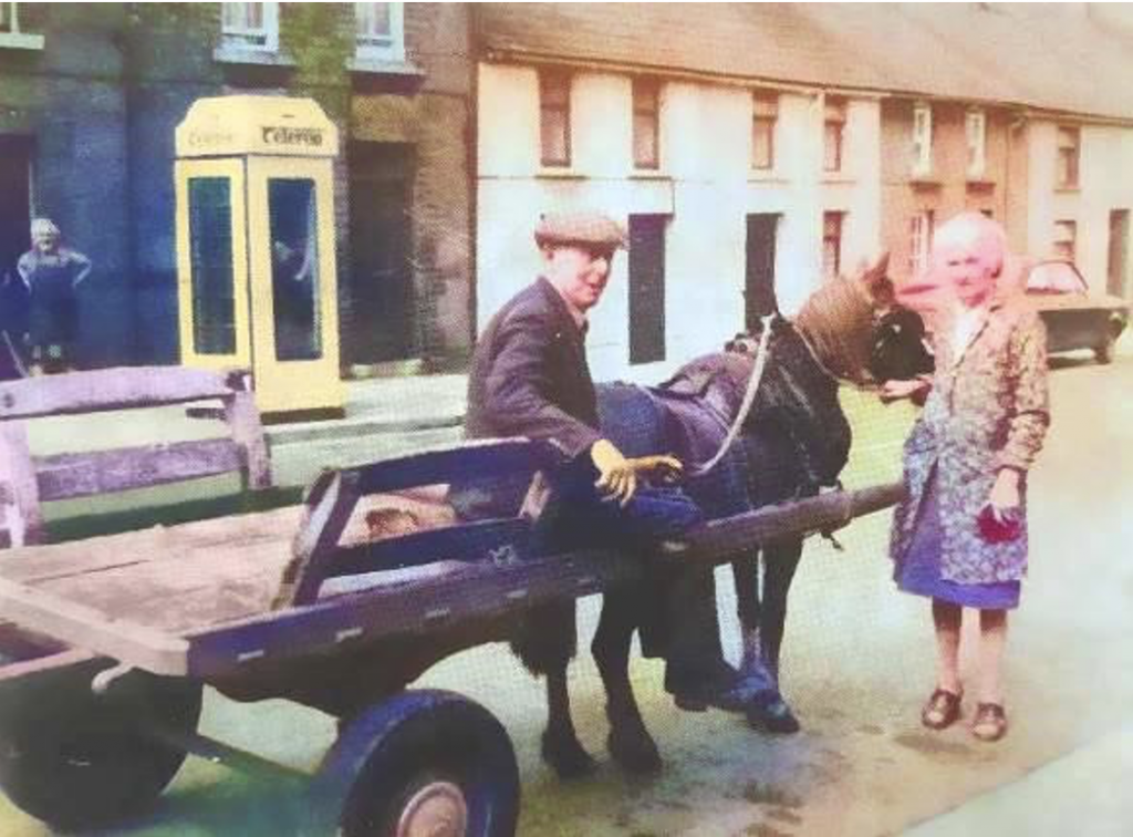 Behind the counter there were shelves on the back wall with big glass jars filled with a variety of sweets from bullseyes to peggy’s legs. Rumour had it, however, that the house next-door was haunted. In the middle of the night the glass jars in Nan’s shop could be heard rattling. No one came knocking at Nan’s door after dark for a couple of Woodbines! My uncle Sunny Darcy, delivered bread from Lydon’s in Mary Street to Nan’s shop with a horse-drawn cart. One day, I was playing on the street when he came along on the cart. Upon seeing me, he asked if I would like a spin on the cart up to the shop. In two seconds I was sitting beside him. I felt I was on the top of the highest mountain in Ireland looking down at the horse in front of me as its gigantic long back moved with it every step like a small earthquake. As we unloaded the bread at the shop, the aroma of the freshly baked loaves was out of this world.
