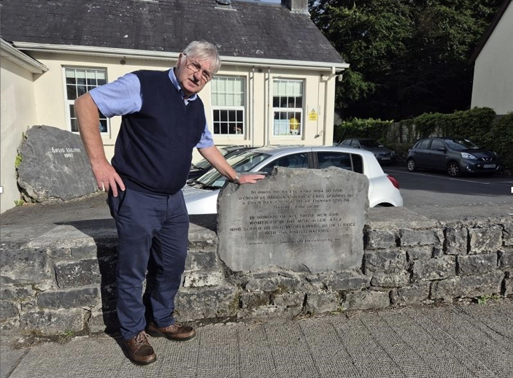 The Commemoration Stone is situated in the boundary wall at Áras Uillinn, Church Road, Maigh Cuillinn. Here, an annual ceremony honours all the men and women from the Moycullen area who served or died in past wars or on service with the United Nations. It was donated by Welby’s Quarry, Moycullen, and inscribed by O’Toole’s of Spiddal. The stone was officially unveiled by Ned Cusack (RIP), retired Colonel of the Irish Army, on 29 November 2014.