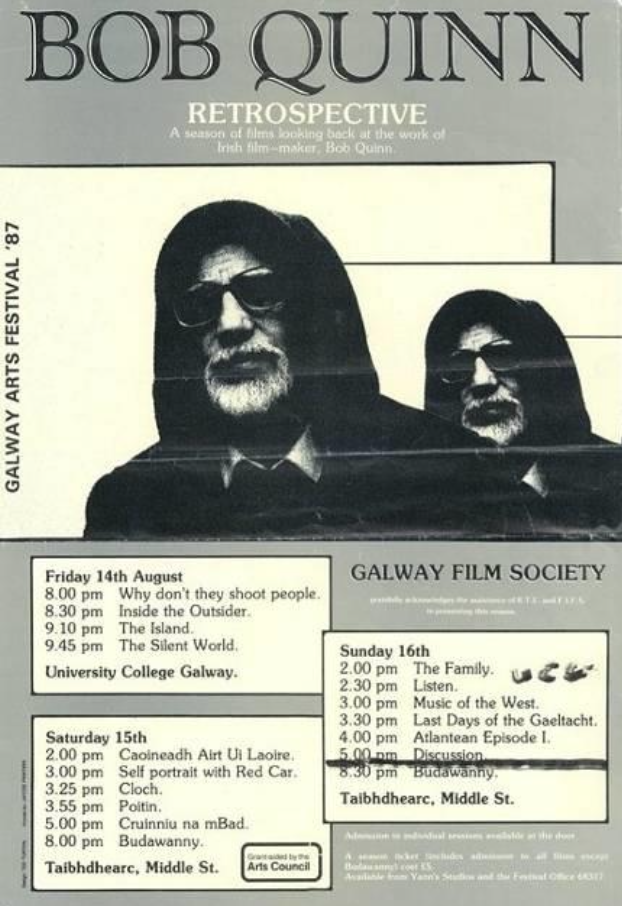 In 1987, the society screened a retrospective of the work of Bob Quinn spanning twentyfive years. This was to acknowledge and honour his prominent place in the independent Irish film industry His films were shown on RTE and Channel 4. Bob Quinn is an Irish filmmaker, writer and photographer who directed Poitín, the first feature film entirely in the Irish language. His work includes Atlantean, a series of four documentaries about the origins of the Irish people. Quinn has a history of protesting against the commercialisation of television. He resigned from RTÉ in 1969 as a protest because of this issue. In 2001, Quinn received a Lifetime Achievement Award from the Irish film Institute.