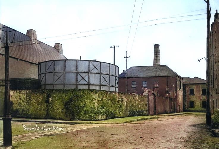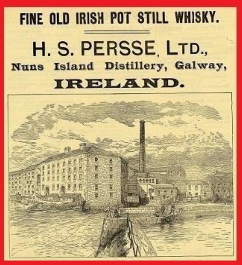 The name Persse is synonymous with Galway, mainly because of their whiskey distillery. The family involvement with the alcohol trade began circa 1800 when Henry Stratford Persse established a brewery at Newcastle. He later went into the whiskey distilling business and established a distillery at Newcastle in circa 1823. His home in Newcastle became known as Distillery House. His son-in-law, Burton Persse took over the business after Henry Stratford Persse died. He purchased the Joyce Distillery at Nuns Island in 1840. The Nuns Island complex consisted of a large and extensive courtyard. There was a series of buildings and offices including Malting and Corn Stores, Kiln, Malt House, Brew House, Spirit Store and five Warehouses containing some 5,000 casks of whiskey. The ground floor buildings were used for receiving stocks of barley and storing machinery. Other buildings were dedicated to the tradesmen; Blacksmith, Joiners, Painters, Cooperage, Cart Sheds and Stables. Cooling pipes were laid out along the bed of the stream nearby and connected to the distillery to prevent overheating. Health and safety was a prominent feature of the distillery, with fire hoses laid out all across the premises.