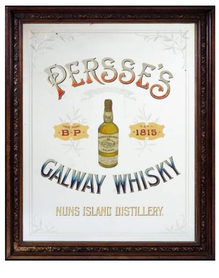 Reminders of this once prestigious distillery can still be found, sometimes in the most surprising places. Persse memorabilia has become extremely collectable and valuable over the past number of years. The large bar mirrors with the beautiful distinctive image are rare, as are the labelled whiskey bottles. A bottle of Persse Whiskey is almost unheard of in any part of the world. There are a number of stories about the last bottle of Persse Whiskey most of which are now confined to folk memory. One story involved the Galway County Club. Shortly after the closure of the distillery, members of the club purchased a few cases of the famous whiskey. They would raise a glass to ‘Persse’ every New Year’s Eve. This tradition continued until circa 1960 when the last ‘drop’ was consumed.